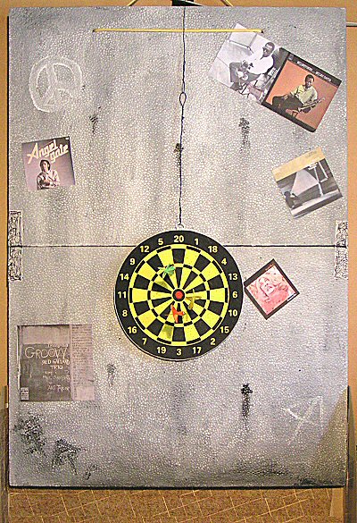 昔から射的が好きだったんですけど… このところダーツがやりたくてしかたなかったのです。しばらく前には自作しようと材料まで揃えてあったのですが、ダイソーで100円のダーツボードを見つけたので買ってきました。 もっともそれだけではちょっと遊べないので、ダーツボードの後ろに保護板を作りました。これもダイソーで売っていた発泡スチロールを二枚ガムテープでつなげ、さらにその背面にあり合わせの段ボールを貼り付けてあります。 そのボードに水性アクリルペイントで汚し塗装をし、レコードジャケットを縮小コピーしたものをペタペタ貼り付けてみました。 ボードに付属していたダーツの矢こそ二本だけだったのでので買い足しましたが、結構面白く遊べます。 |