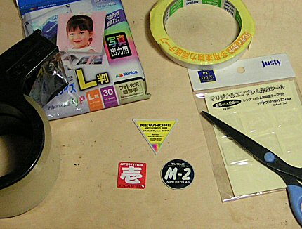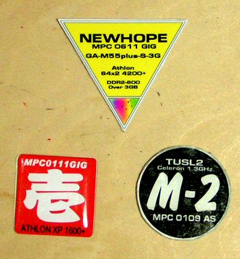 エンブレムにはマシンの愛称とマザーボード・CPU名を書き込んである。ペイントショップで原画を作成、写真用の光沢プリント用紙に印刷し、その上から梱包用の透明テープを貼る。裏側に両面テープを貼って外郭線に沿って切り抜けば出来上がりだ。 |