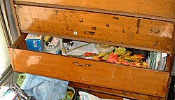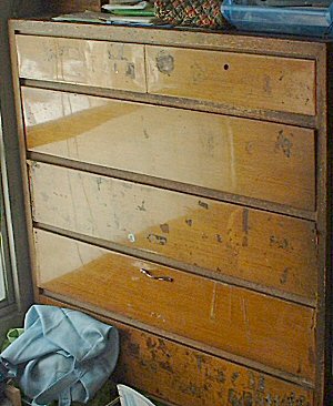 ![]() そもそもが安物なので壊れている段もある。引き出しの正面側の板が外れてしまい、それを梱包用の紙テープで留めて使っていたのだ。 いつか修理したいと思っていたのだが、半年ほど前にやっと手を入れることが出来た。 どんな風に直したかというと… |