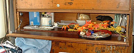 ということで、ただ単純に修理したのではなく、正面に取っ手をつけて外開きに開くようにし、飾り棚としても使えるように改良(?)したのである。一応、位置は母が普段座っている場所からの目線に合わせてみた。 作業の途中で、おそらく死んだ父が打ったと思われる細い釘や接着剤の跡が見つかり、父も苦労して直しながら使っていたんだなあと思ったのである。 |