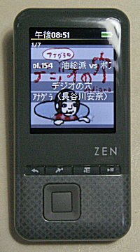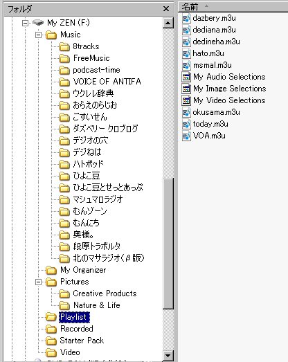 実際に使用するのはほとんどウォーキング時なので、このフックを使って紐で首からぶら下げるか、腕にマジックテープのバンドを巻いて、そこに貼り付けて使っている。 もうひとつはソフト的な「改造」なのだが、一番目の写真に写っているようにアルバムアートを表示させてみた。 おそらく製品添付の専用ソフトを使って音楽などを転送すれば自動的にアルバムアートを表示するようになるだろうし、そもそもダウンロードしたファイルに画像データが内包されていれば、それが表示されると思われるが、今回ぼくがやったのはそれがなくても強制的に表示させようということである。 ZEN Style100 4Gタイプをパソコンに接続して中身を見てみると、いくつかのフォルダが作られているのがわかる。 |