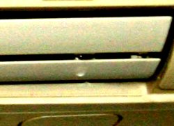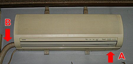 今年の猛暑はどうやら記録的なものになったようだが。 15年前の夏、両親が暑さで食事が取れず、病院で点滴を受けてやっと暮らしていると電話で言ってきた。 当時両親はまだ70になっていなかったはずだが、なんにせよこれはそろそろ危ないかなと感じ、ぼくは半年後に家に戻って同居生活を始めた。 その時、真っ先にしたのは、32ビットパソコンとエアコンを買いに行くことだった。そのどちらもが、ぼくにとっても両親にとっても初めて持つものだった。それぞれ20万円以上したと思う。 ちなみにパソコンはFMV、エアコンは東芝のRAS-281GDだった。これは団地の構造上、エアコンの付けられる場所が家中でたった一カ所しかないので、場合によっては二部屋同時に冷房できる性能を考慮した選択だった。 パソコンはその後フル稼働するようになって、ぼくはネットの世界にどっぷり漬かることになるのだが、両親の方はと言えば、心配したのが嘘のように元気になってしまい、そしてエアコンはそのままほとんど使われることがなかった。 やがて父が亡くなり、母もずいぶんと老け込んで、この数年、しだいにエアコンの利用頻度が上がってきた。それが母の体力が落ちたせいなのか、それとも地球温暖化のせいのなのか、判然とはしない。 いずれにしても、ついに今年の夏は毎日ほとんどの時間、クーラーが付けっぱなしの状態となってしまった。 ところがである。 8月の半ばに突然エアコンから水が噴き出してきた。(矢印A) 朝見た時に、エアコンのすぐ下側の窓ガラスに水が流れたような跡があることに気づいていたのだが、夕立のせいと思い込んでほったらかしてしまったのが悪かった。 その日の夜になって母が「カーテンが濡れてる」と言い出したのだ。 もうその時にはエアコンから垂れてくる水で、カーテンも畳も相当に濡れていた。ともかくもクーラーを止めてそのあたりを片付けたのだが、さあどうしようということになった。 母は今すぐ修理を呼んでくれと言うが、もう夜の10時で当然そんなことは不可能だった。というより、その日は折悪しく13日の金曜日(!)で、翌日は週末の上、世の中はお盆休みである。そもそも即日修理ということ自体頼めるかどうかなのである。 ああ、朝のうちに気づいて対処していればよかった! |